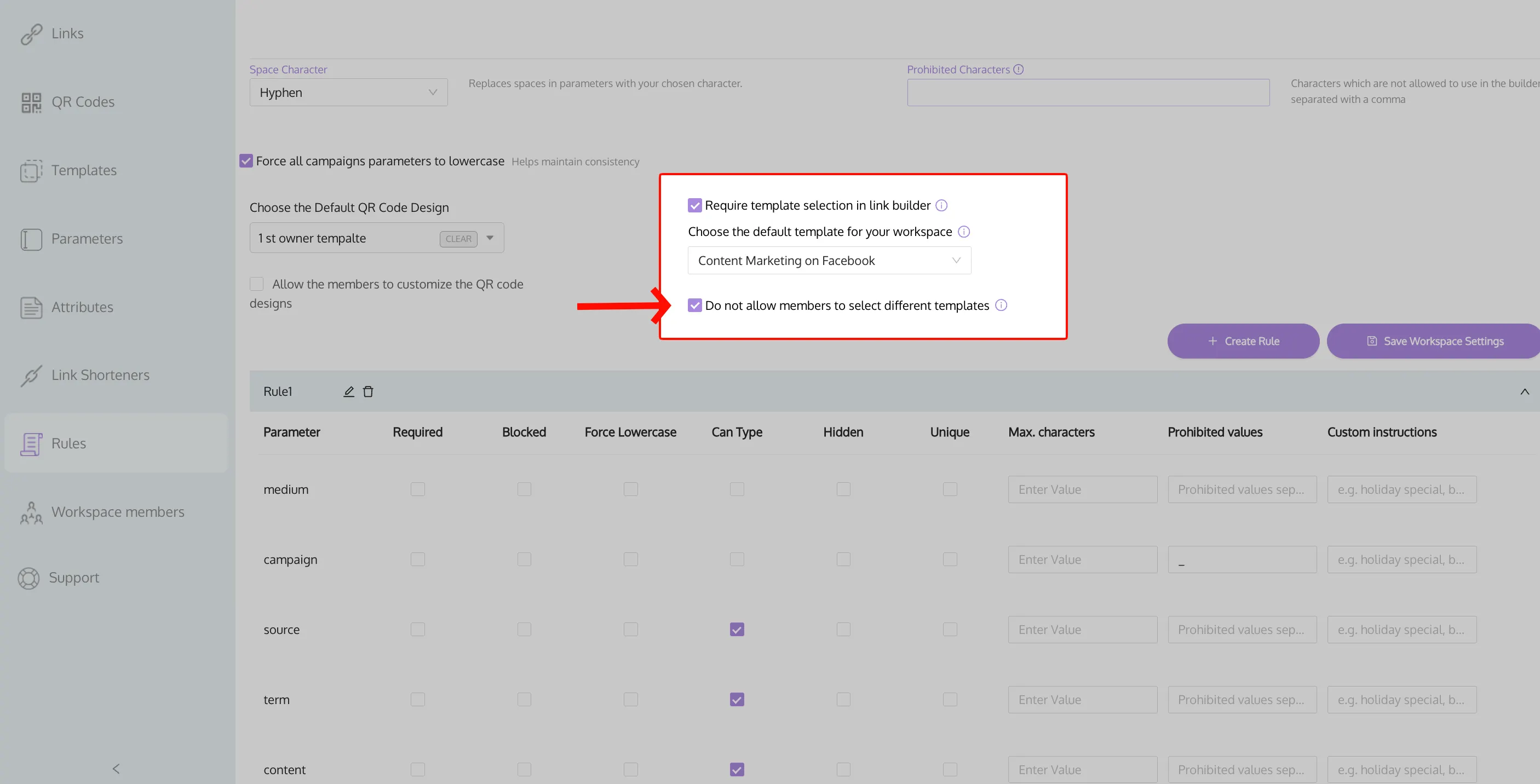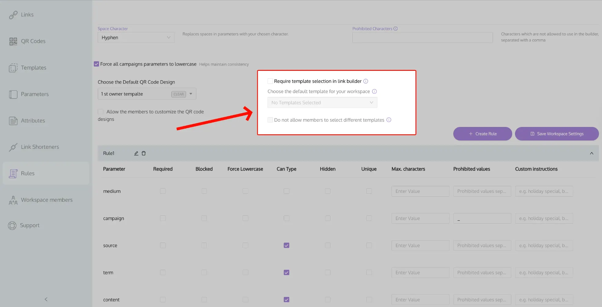 By default, the UTM Template Requirement Rule is off, allowing team members to create links without selecting a template. You can choose from several configurations depending on your goal: