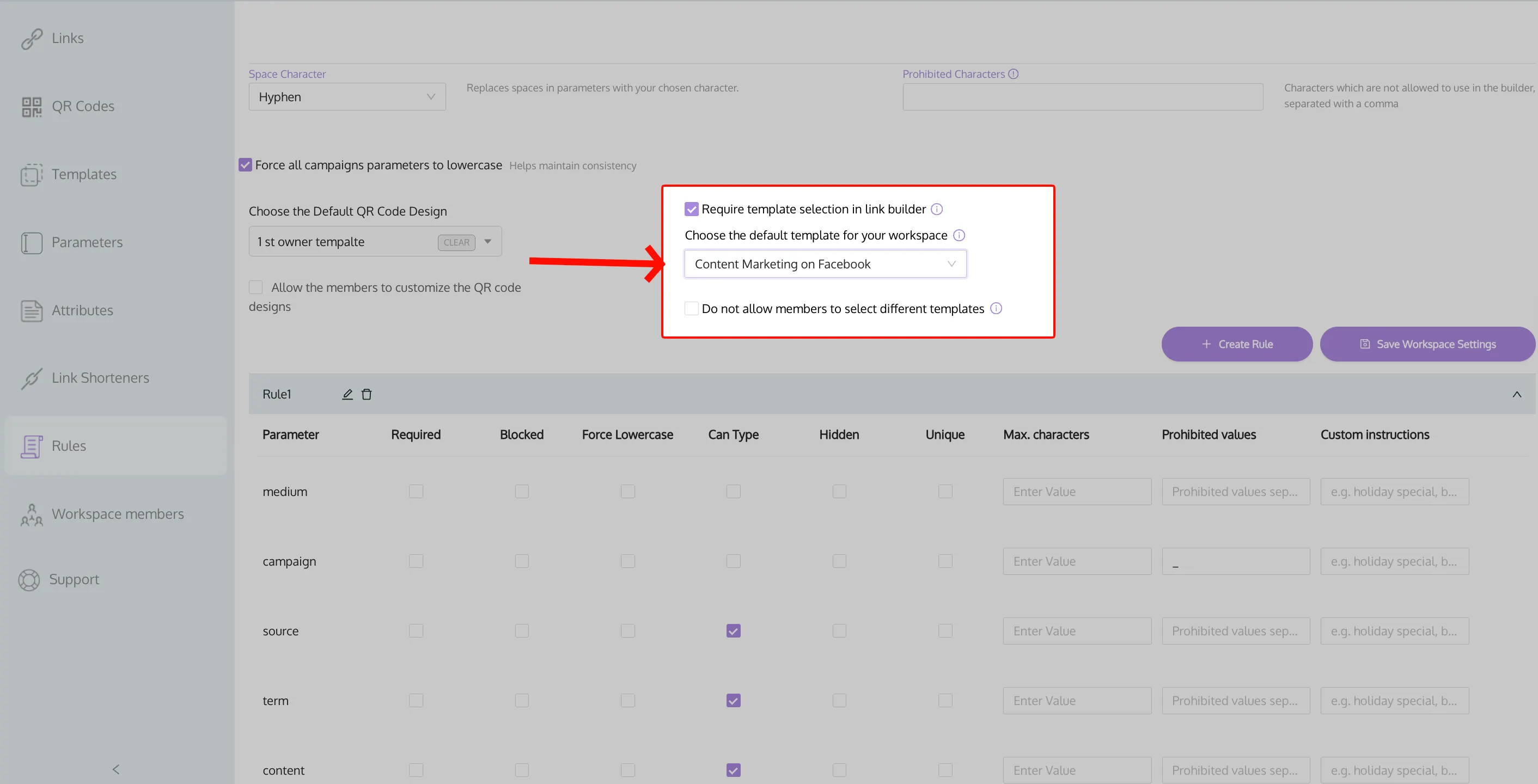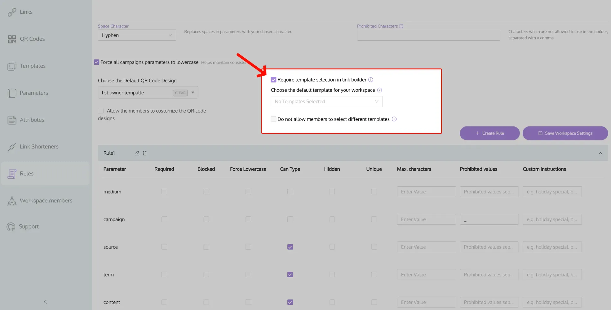 The UTM Template Requirement Rule allows account and workspace admins to require one or more UTM Templates in the UTM link builder, ensuring consistent campaign conventions for tracking when creating UTM campaign links.